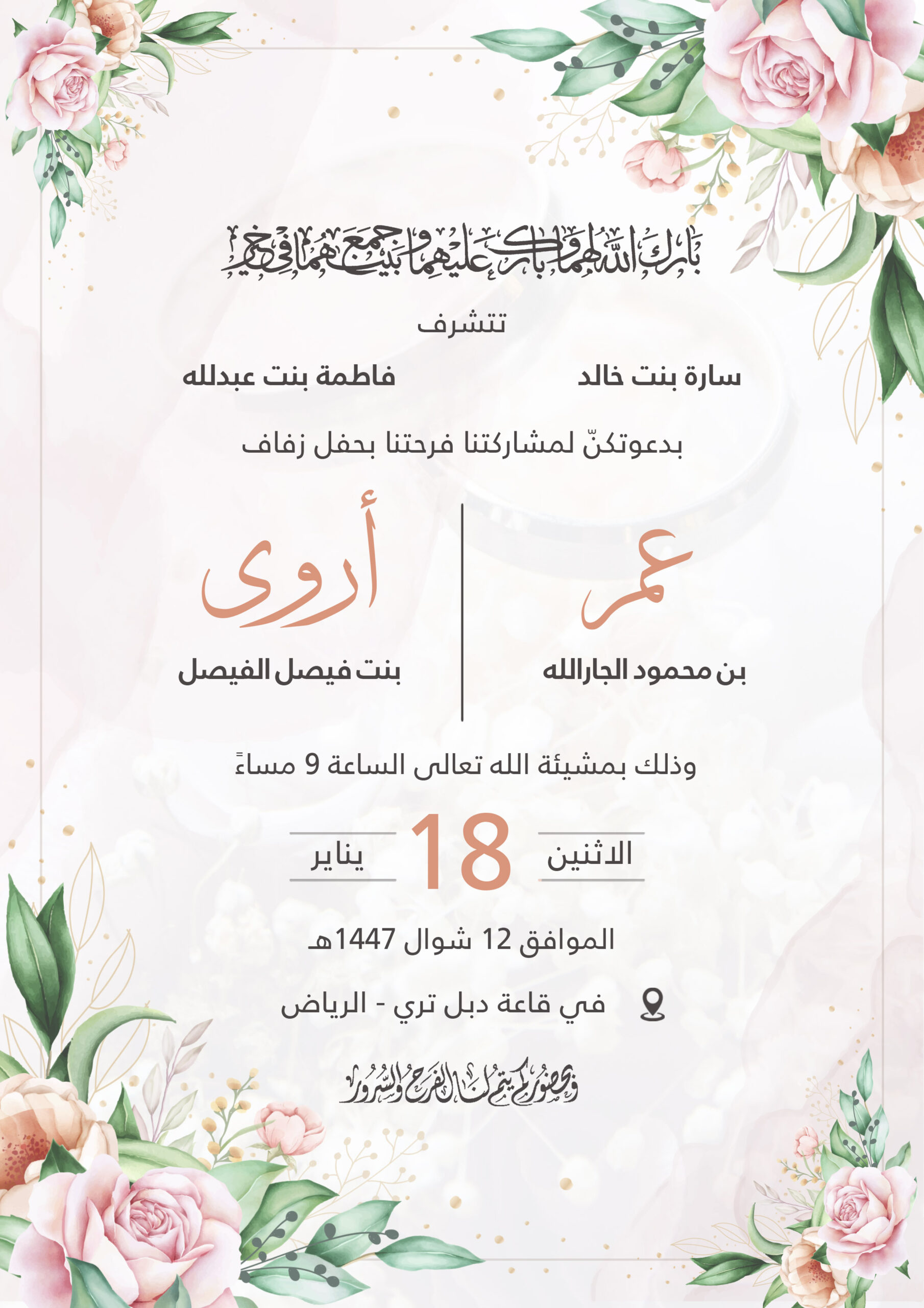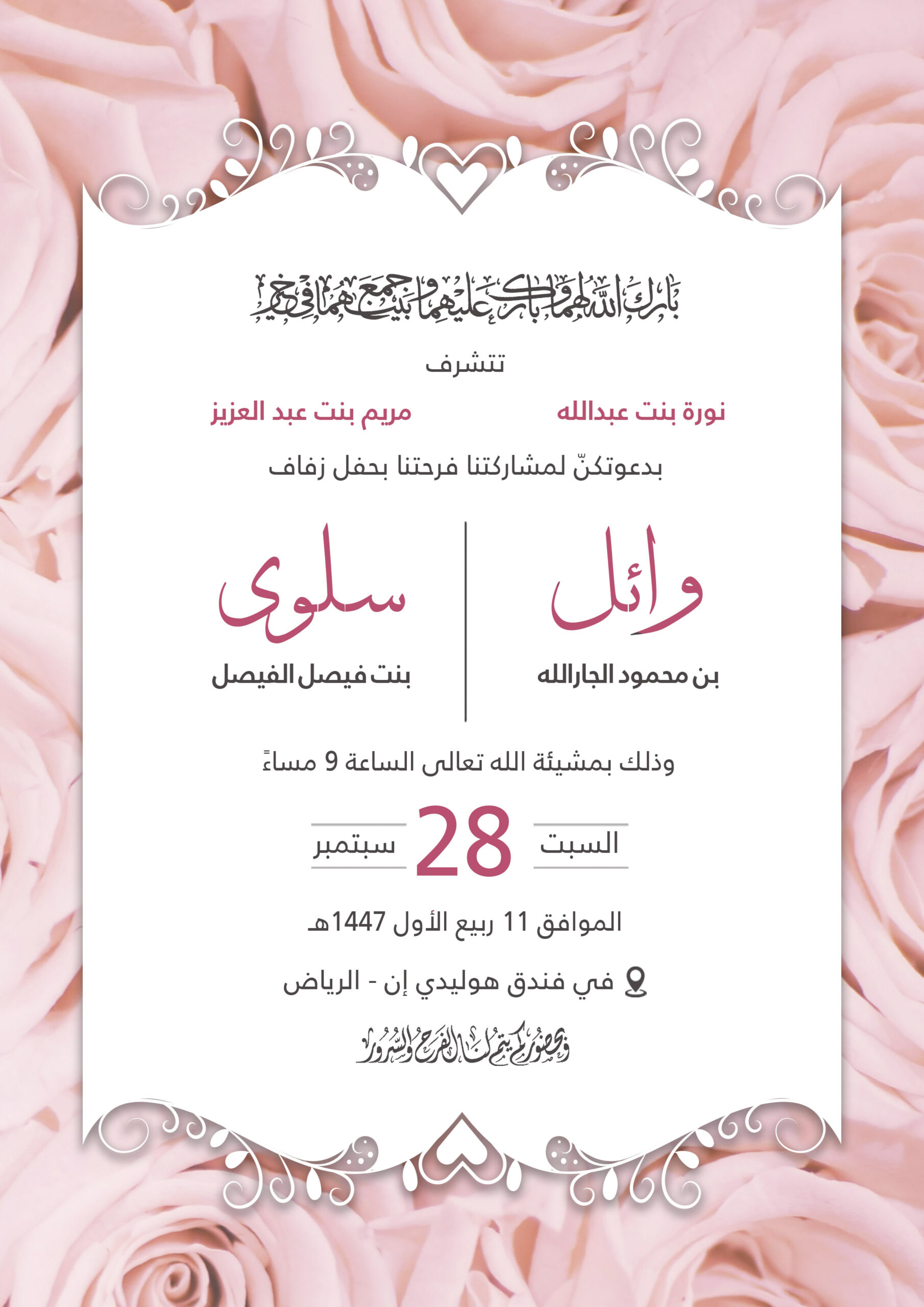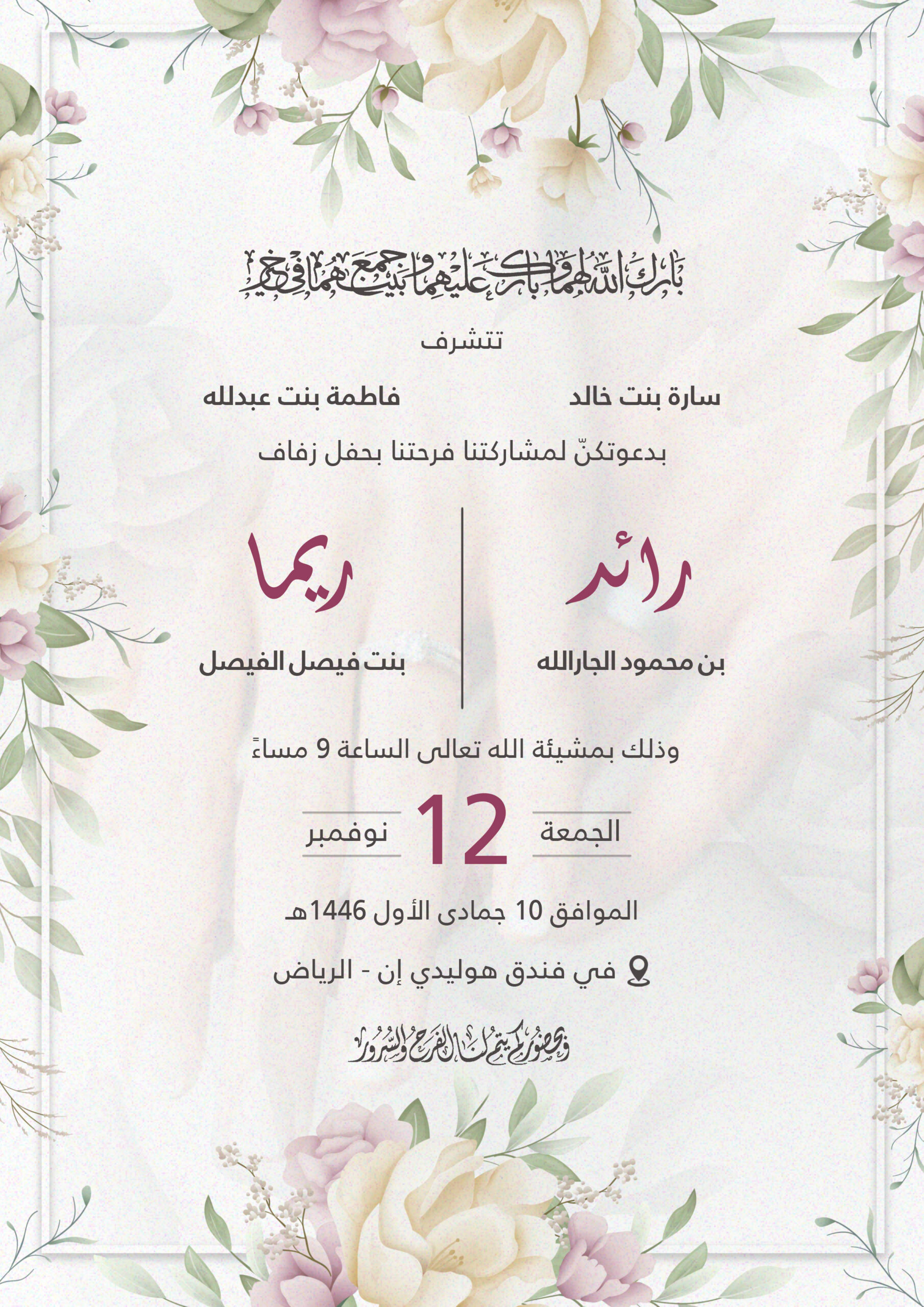 نضع بين أيديكم مجموعة واسعة من القوالب الجاهزة والمصممة بلمسات فنية راقية، لتمكنكم من اختيار ما يلائم تطلعاتكم ويمنح دعواتكم طابعاً فريداً بكل سهولة.