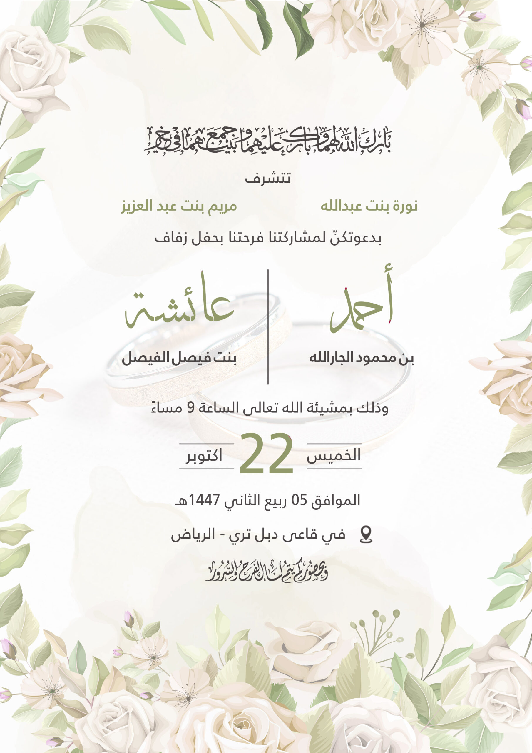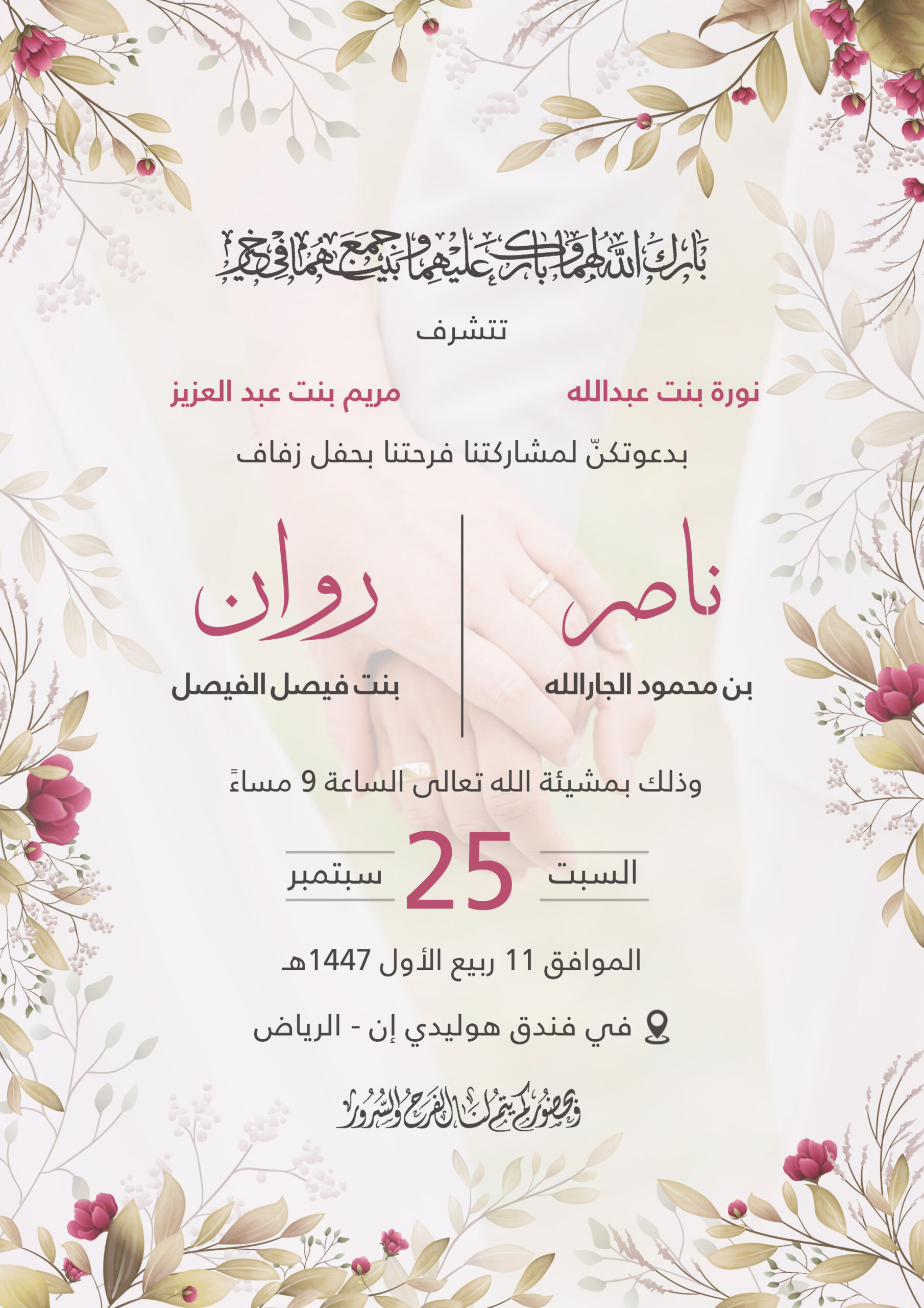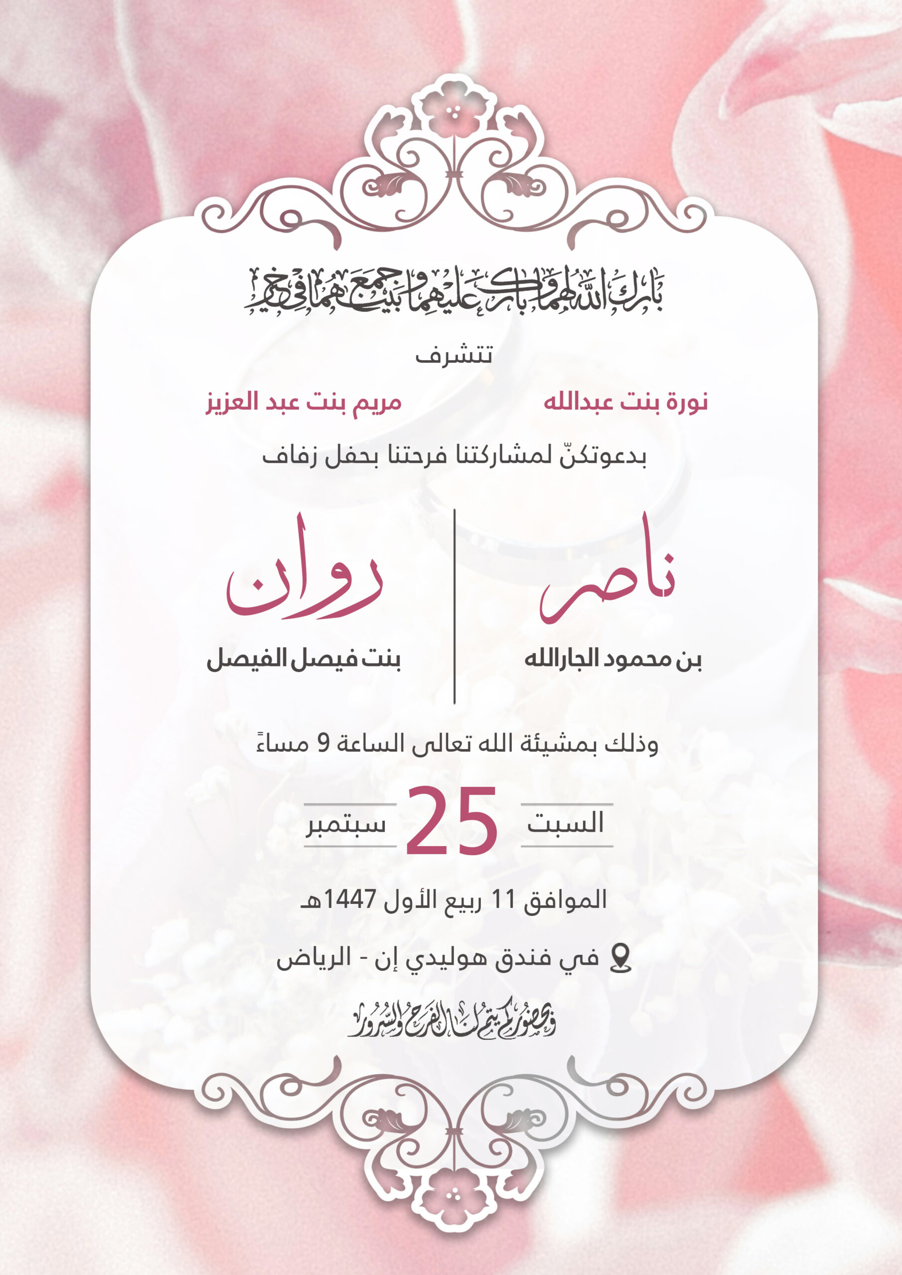 نضع بين أيديكم مجموعة واسعة من القوالب الجاهزة والمصممة بلمسات فنية راقية، لتمكنكم من اختيار ما يلائم تطلعاتكم ويمنح دعواتكم طابعاً فريداً بكل سهولة.
